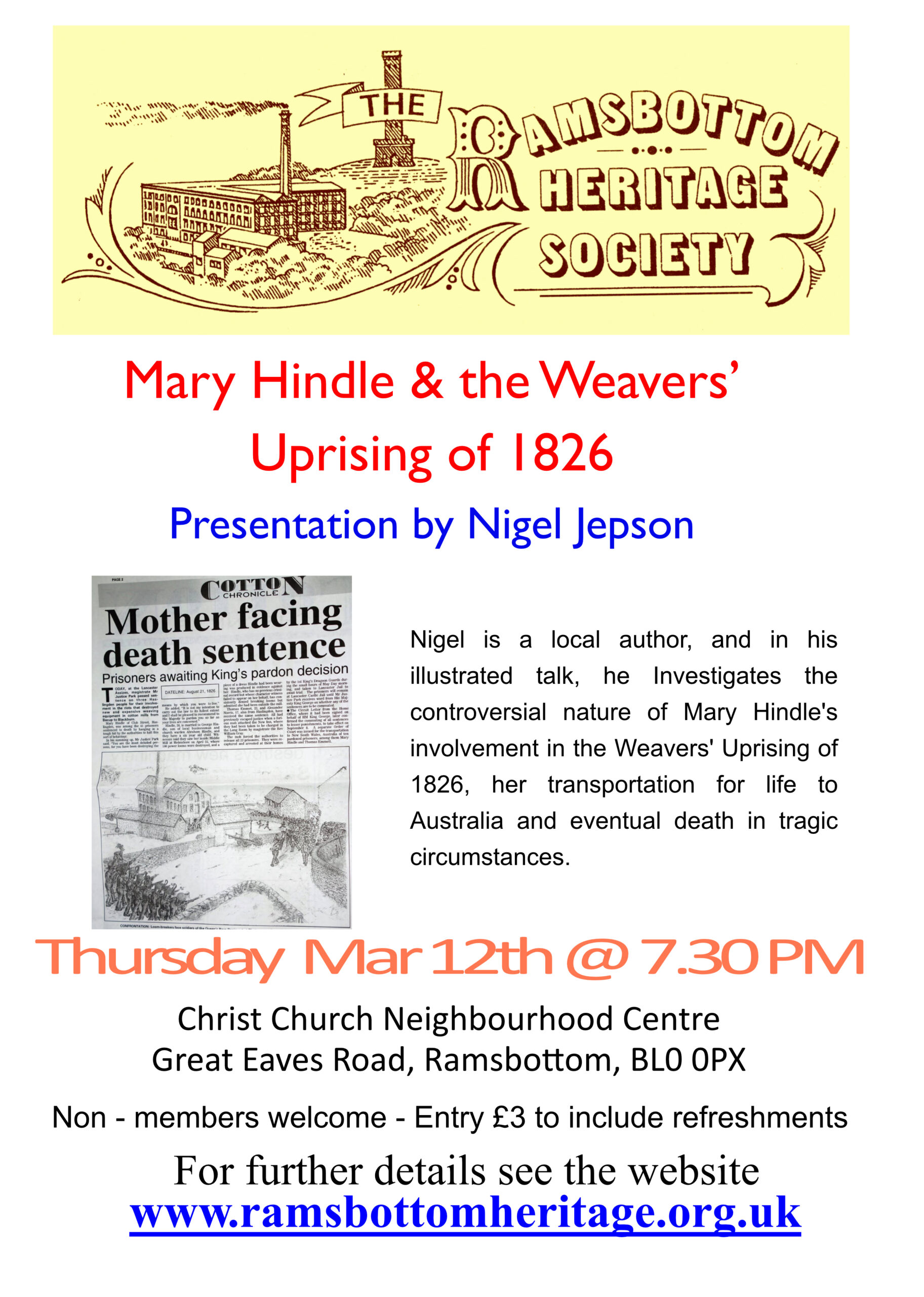 March 12 Nigel Jepson: Mary Hindle & the Weavers’ Uprising of 1826.